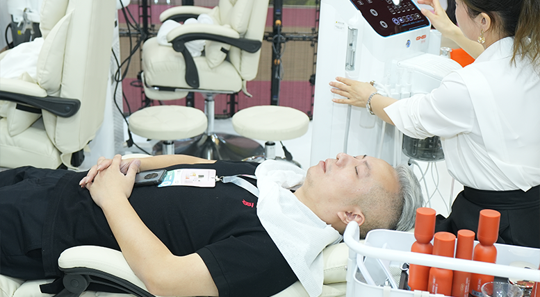 奢思雅展位位于 W1 館 A13,展臺設(shè)計以酵母紅為主色調(diào),燈光明暗交匯碰撞 品牌煥新的活力,搭配曲白、金色輔助,以地質(zhì)色彩詮釋時間的沉淀,沙漏造型 與分裂的酵母巧妙融合,別具一格抓人眼球,傳遞品牌做“酵母護膚”賽道長期 主義踐行者的決心。 整體設(shè)計高端有品位,簡潔不失大氣,同時設(shè)立無針?biāo)?、美妝造型等服務(wù),引 眾多現(xiàn)場觀眾試用體驗、拍照打卡,成為點燃全場的吸睛展臺。